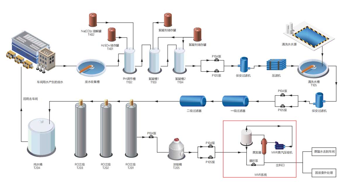 依据工艺废水的成分及特点,采用分流收集模式,通过化学沉淀法、化学还原法、电化学法、膜分离技术、离子交换法、生物处理技术、重金属捕捉剂等方法的综合使用,并结合RO水系统,做到中水回用,使清洗水量的使用量减少1/3~1/5。